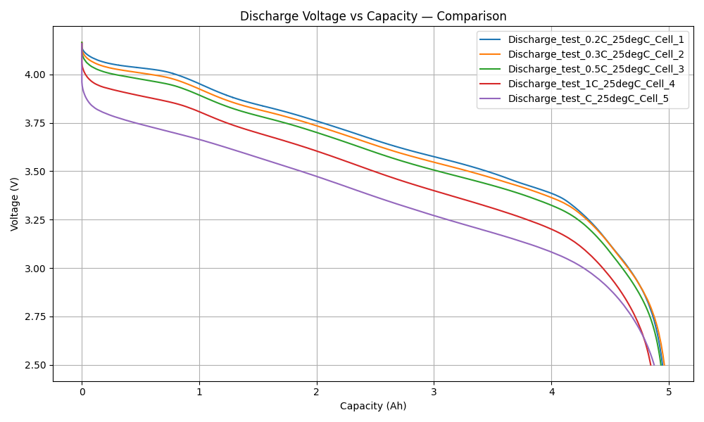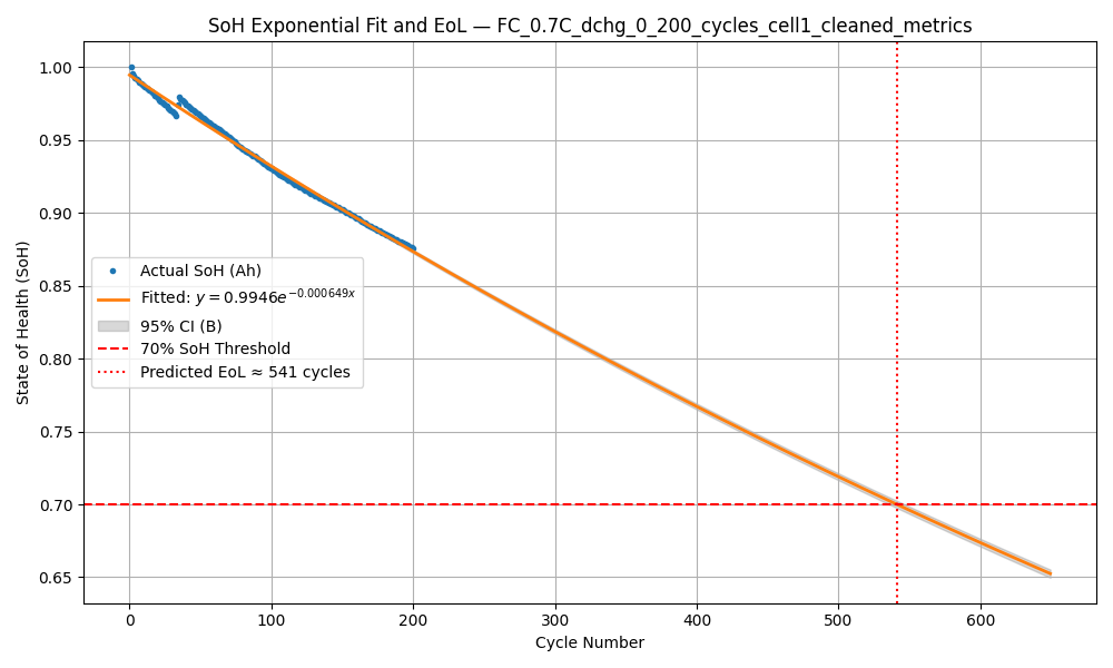 Please see below examples of how our Python scripts can generate cell discharge rate capability graphs and cell cycle ageing graphs from raw datasets. In the latter, we have provided an example of automated data fitting to aid in ageing modelling, where the degradation curve is extrapolated to predict when the cell will reach end of life (70% SoH in this example).